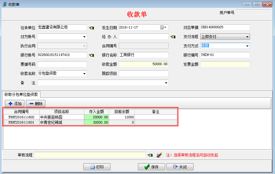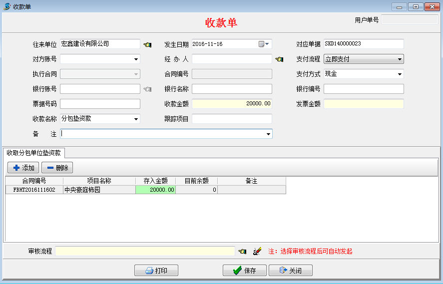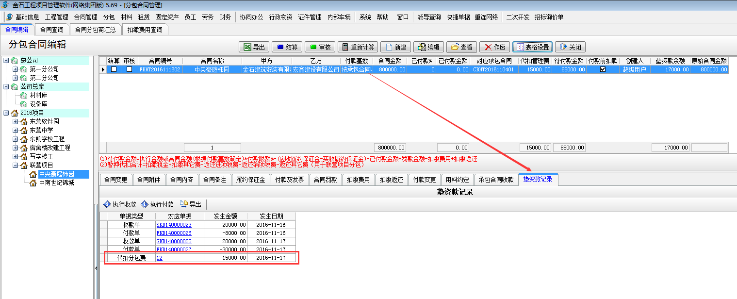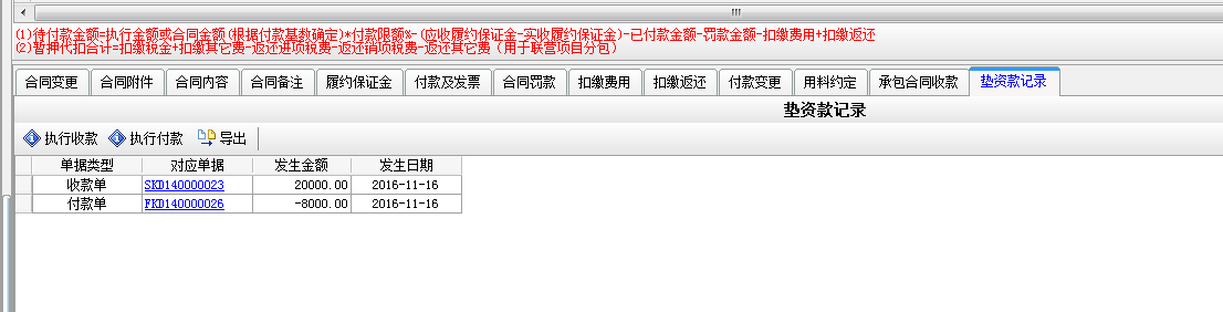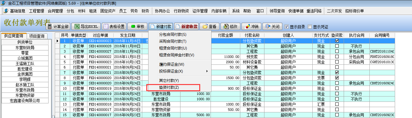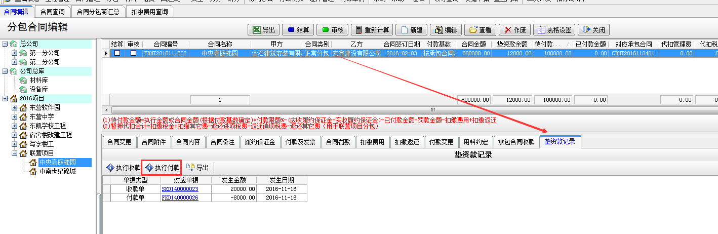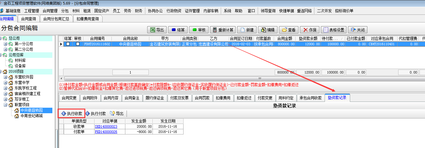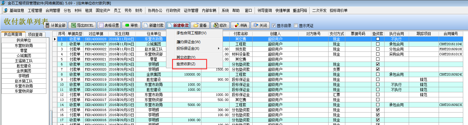 在工程項目管理軟件【分包合同】-【墊支款記錄】處選擇執(zhí)行收款,或者在【財務管理】-【付款單收款單】新建收款單選擇墊資款收款。