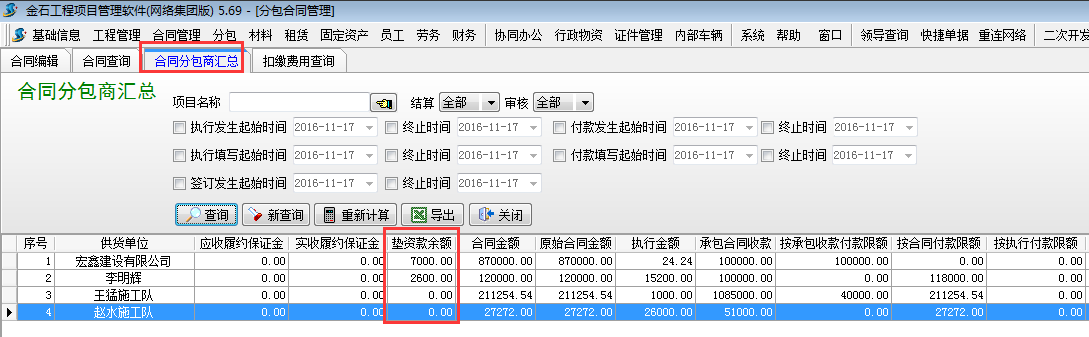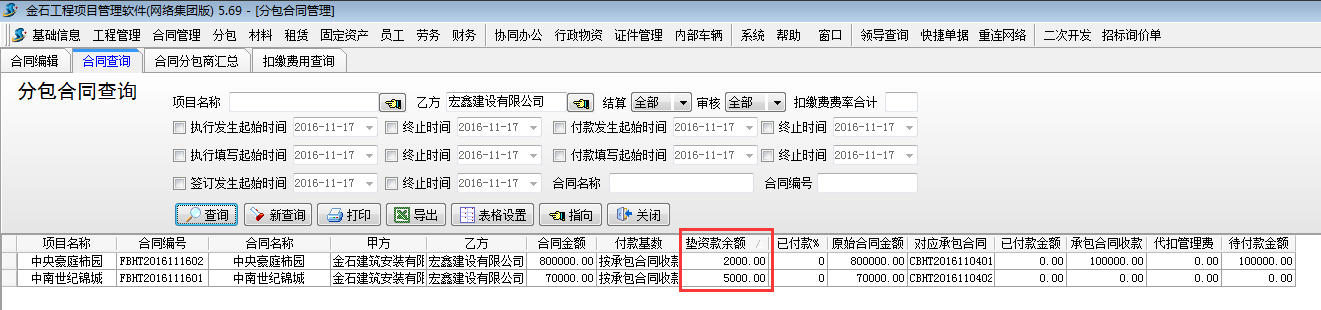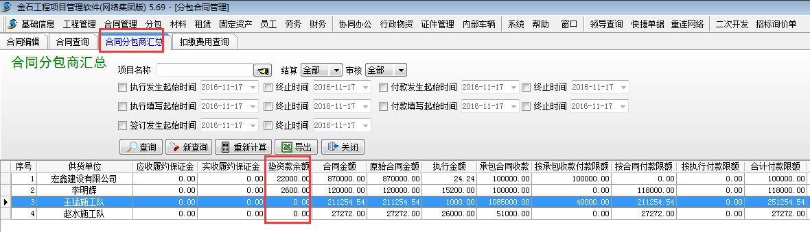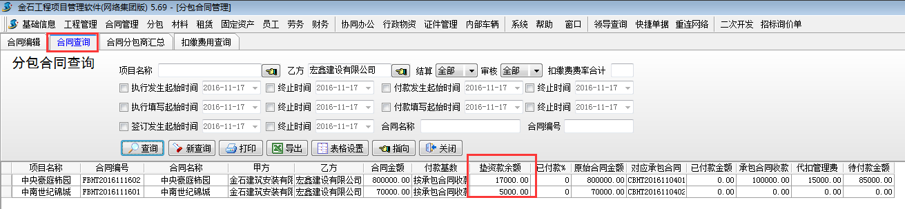 3.1 查詢聯(lián)營單位所有墊資款余額??梢栽凇痉职贤?【合同分包商匯總】處查詢。3.2 按合同查詢各合同墊資款余額。可以在【分包合同】-【合同查詢】處查詢。