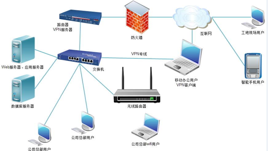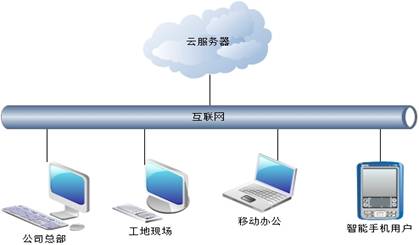 普通版,適用于操作員在公司總部辦公為主的公司,服務器架設在公司總部,工作總部工作人員可通過公司部署的局域網(wǎng)訪問服務器,工地現(xiàn)場及移動辦公用戶采用互聯(lián)網(wǎng)訪問的方法使用軟件,為了訪問穩(wěn)定及數(shù)據(jù)安全可以在公司總部架設vpn 或域名解析軟件,廣域網(wǎng)操作用戶采用vpn撥號、或域名訪問的連接的方式連入公司局域網(wǎng)內。