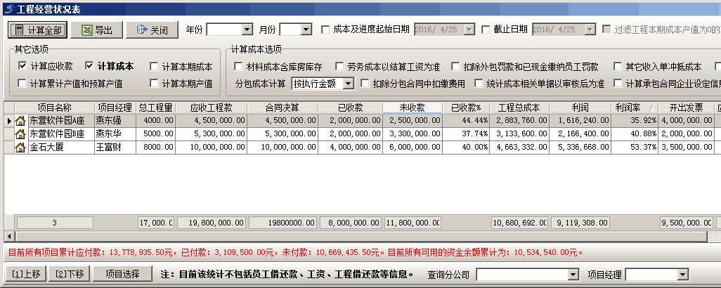 可查詢出項目(包括所有項目、某一子公司的項目、某資質承接的項目、某項目經(jīng)理承包的項目、某開工年度的項目)結算進度、應收工程款、已收款、未收款、工程總成本、完成產(chǎn)值、利潤、開出發(fā)票、收到發(fā)票等信息,并統(tǒng)計出目前可用資金余額。