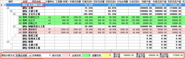 對于某些工程,高水平的項目經(jīng)理可以把實際完成量做小,需要的達到的效果是“實際干的進度小于向甲方上報的進度”。在金石軟件中能很好地體現(xiàn)“實際進度”、“形象進度”兩個概念,在進度填報過程中可以將“實際進度”、“形象進度”分別填報。并且將清單“甲方合同量”、“分包合同量”、“形象完成量”、“實際完成量”四者的關系完全展現(xiàn)在一起。