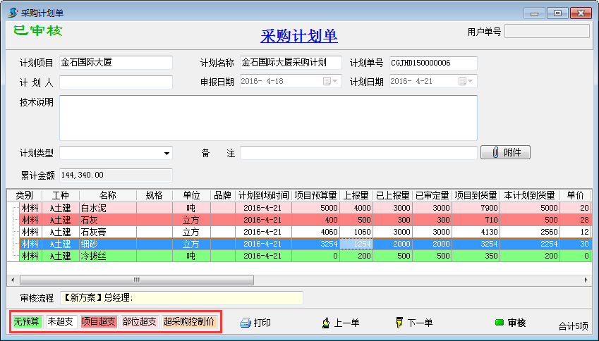 4、材料超預算實時提醒