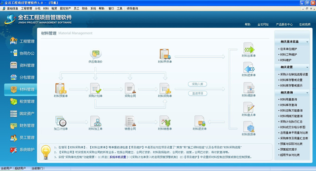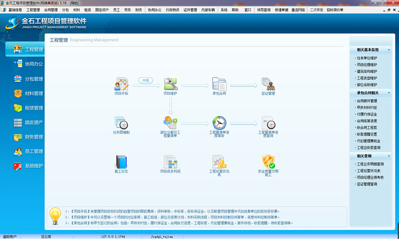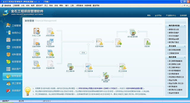 本軟件是金石軟件公司以眾多施工企業(yè)管理現(xiàn)狀為出發(fā)點,深入了解施工現(xiàn)場,經(jīng)過七年地不斷完善與努力,打造成為一款成熟、靈活、實用性極高的信息化內控管理平臺。軟件以成本控制為核心,以資金管理為主線,全面解決項目管理難題,提升項目管控能力。對工程的投標管理、中標后的進度管理、分包管理、采購招標、材料管理、租賃管理、固定資產(chǎn)管理、員工管理、勞務管理、資金管理、押金管理、發(fā)票管理、稅金核算、聯(lián)營管理、文檔資料管理、物資管理、安全質量管理、證件管理、車輛管理、工程結算、等進行全方位管理,并提供強大的OA功能,能夠實現(xiàn)各部門之間的數(shù)據(jù)共享及業(yè)務單據(jù)網(wǎng)上簽批審核。并且提供了強大的自定義工作流驅動和各種流程開關,企業(yè)可根據(jù)自己情況自行設定,從而規(guī)范企業(yè)管理、讓工作流程正歸化、簡單化。通過工作流,讓信息送審、審批更貼近日常公司管理模式,申請人可隨時看到當前業(yè)務的審批進度和各領導的審批意見。