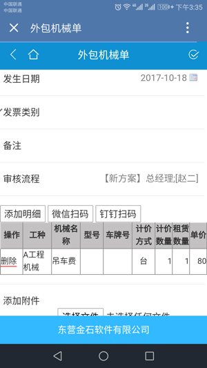 業(yè)務單據(jù)支持外掛附件的功能,通過PC終端連接高拍儀、攝像頭拍照或手機在錄單時拍照等方式生成的照片存到單據(jù)附件中。比如可將現(xiàn)場供應商到貨清單、產(chǎn)品質量合格證拍照,存到單據(jù)附件中。還可以將一些證件、合同原件資料掃描或拍照存到軟件中,方便以后在PC終端或移動終端查閱。