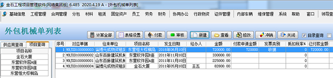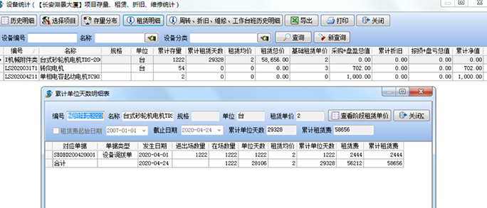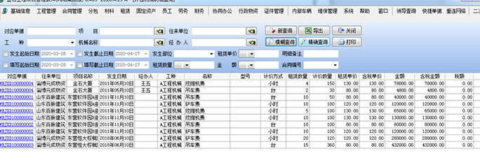同時(shí),已經(jīng)生成的各種信息,可以在【外包機(jī)械明細(xì)查詢】模塊查詢所有的機(jī)械往來(lái)明細(xì)。