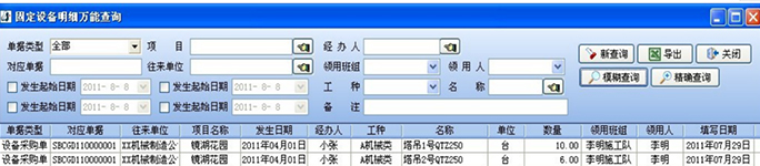 每日的信息也將在系統(tǒng)中自動(dòng)匯總,形成固定設(shè)備明細(xì)萬(wàn)能查詢,可以說(shuō)是固定設(shè)備使用的總賬。