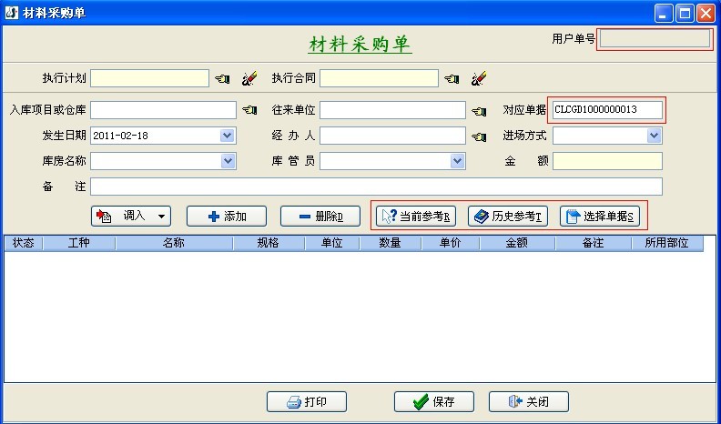 【選擇單據(jù)】:根據(jù)歷史發(fā)生的同類單據(jù)再次選擇,提高錄入效率。如:在【材料出庫(kù)單】中可以通過(guò)【選擇單據(jù)】調(diào)用【材料采購(gòu)單】的入庫(kù)單明細(xì),即要填寫的出庫(kù)材料直接從采購(gòu)入庫(kù)的材料中選擇出來(lái)。
