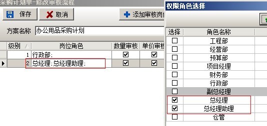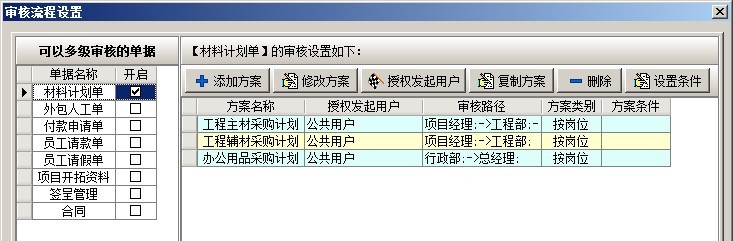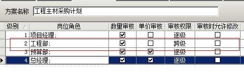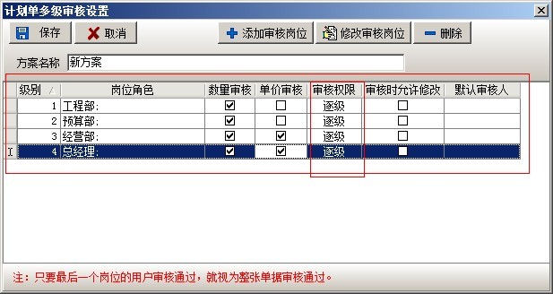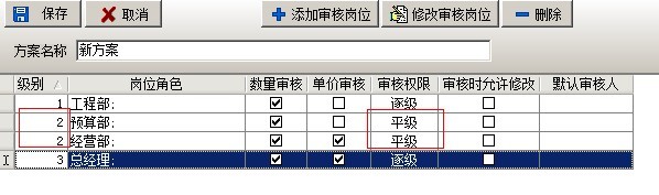 在多級審核中,可以設置多套審核方案,每套方案可設置多個崗位,可設置方案的授權發(fā)起用戶(在業(yè)務單據(jù)中選擇該審核方案的用戶)。在添加方案時,有三種方式逐級審核、平級審核、跨級審核。逐級審核是指各個崗位按先后順序依次審核該業(yè)務單據(jù),例如審核順序為,工程部、預算部、經(jīng)營部、總經(jīng)理如下圖: