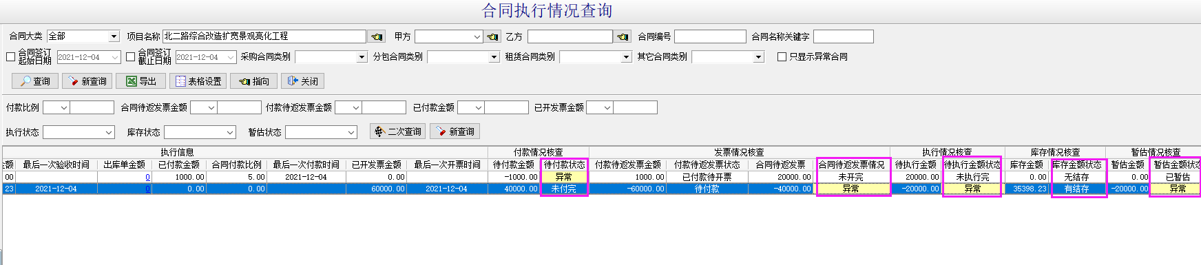 付款情況核查:待付款金額大于0;顯示“未付完;”;等于0,顯示“已付完;待付款小于0顯示“異常”,標(biāo)注“黃色”