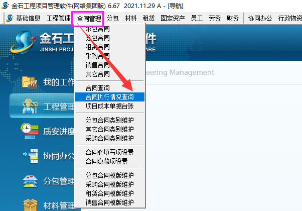 “采購(gòu)合同”、“分包合同”、“租賃合同”、“其他合同”等查詢項(xiàng),過(guò)去這些查詢項(xiàng)只能單獨(dú)查詢各自所對(duì)應(yīng)的 材料、分包、租賃、其他費(fèi),不能提供系統(tǒng)的匯總數(shù)值查詢,鑒于此,金石工程項(xiàng)目管理軟件新版本中新增 “合同執(zhí)行情況查詢”用于對(duì)下游合同的綜合匯總查詢。