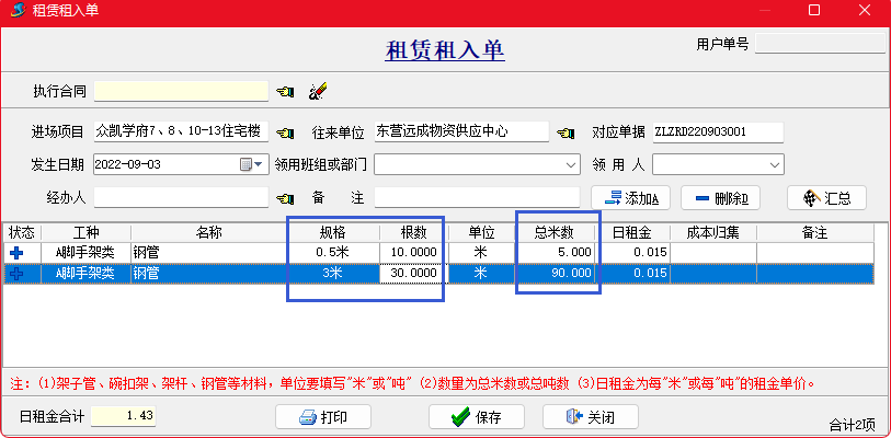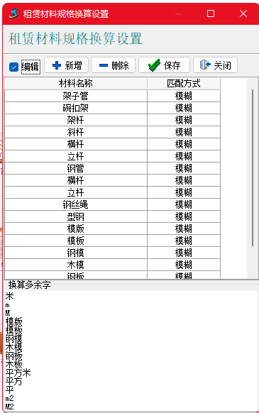 【租賃材料規(guī)格換算設(shè)置】可實(shí)現(xiàn)自定義指定某些租賃材料的總長(zhǎng)度換算、總面積換算、重量換算,并可以自動(dòng)去掉多余的字。