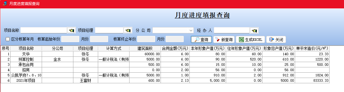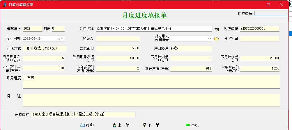 月度進(jìn)度填報單可以實現(xiàn)按月上報形象產(chǎn)值進(jìn)度并自動統(tǒng)計當(dāng)年度產(chǎn)值,總產(chǎn)值以及單平米造價??梢钥梢愿鶕?jù)上報的產(chǎn)值計算待收款以及利潤。