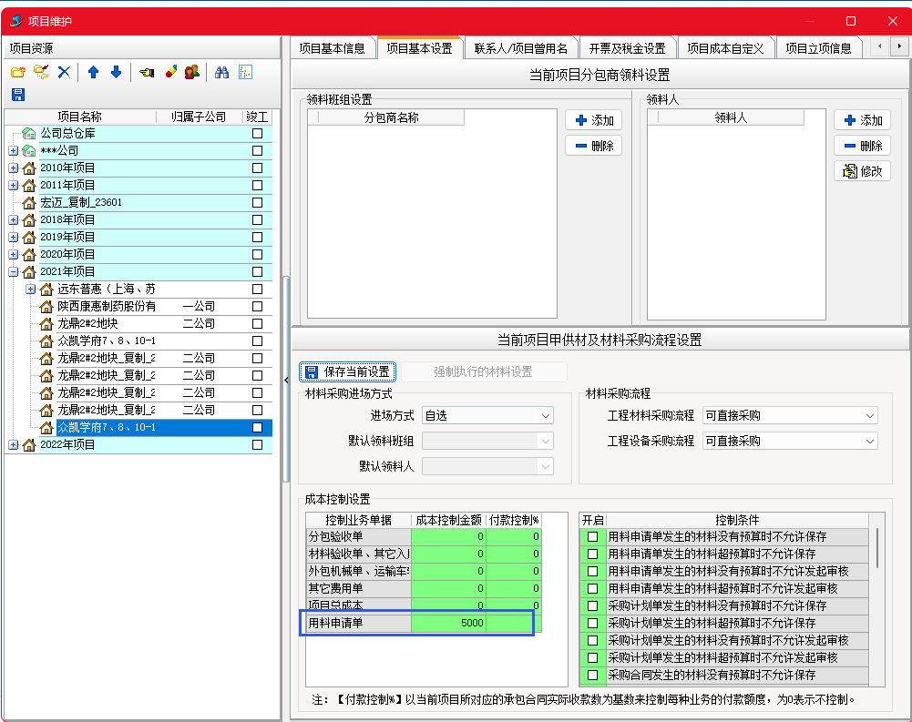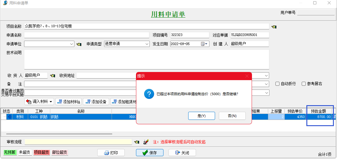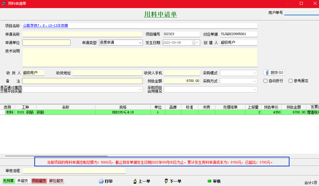 金石工程項目管理軟件項目維護(hù)增加用料申請控制功能,用于控制用料申請控制,超出控制金額系統(tǒng)會自動報警。