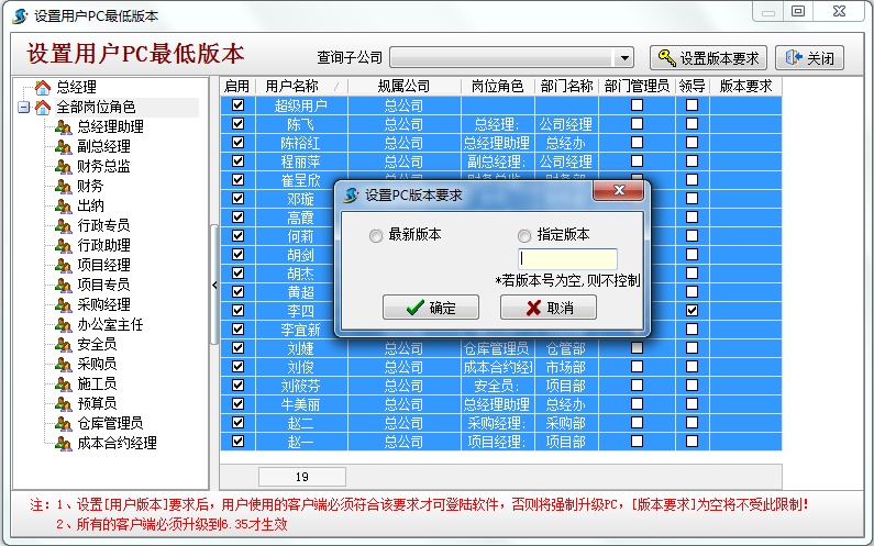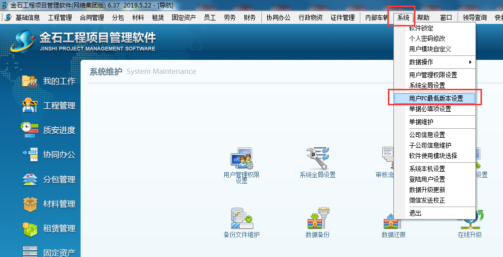 在使用金石工程項目管理軟件的過程中經常會碰到有的同事升級了較新版本的新功能,其他同事還在使用老版本不能更好的體驗金石軟件新功能,在6.35版本中我們對此進行了限制,可要求所有用戶均升級最新版本或指定的版本,否則系統(tǒng)將將強制升級,操作流程如下: