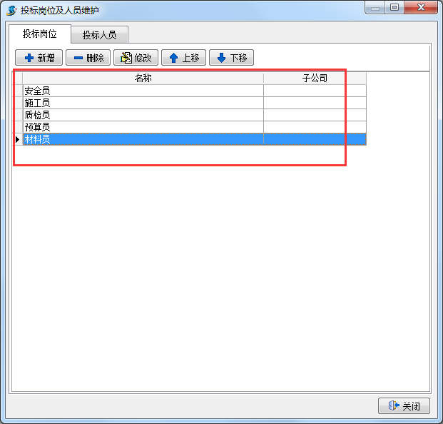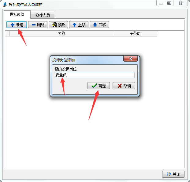 在新打開的維護(hù)窗口中,點(diǎn)擊新增,依次添加需要的投標(biāo)崗位,如下圖:
