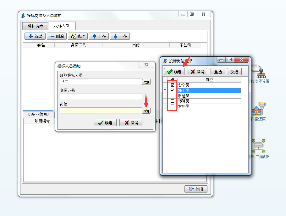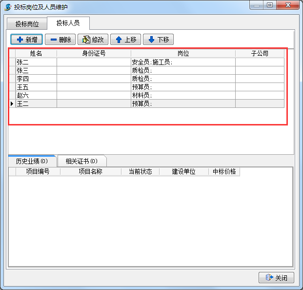 錄入好姓名后,選擇相對應(yīng)的崗位(選擇崗位時(shí),可以一人設(shè)多崗),依次添加好投標(biāo)人員后,關(guān)閉該窗口,如下圖: