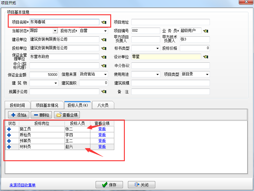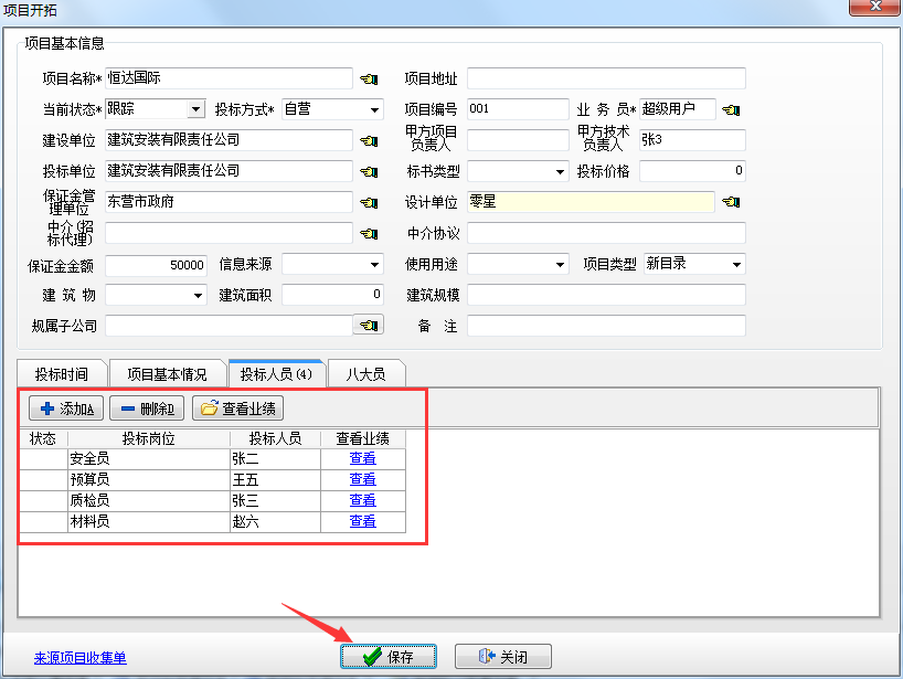 添加完投標(biāo)人員后,點(diǎn)擊保存該項(xiàng)目新建完成,如下圖: