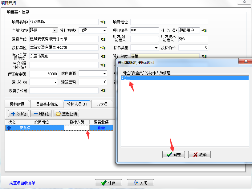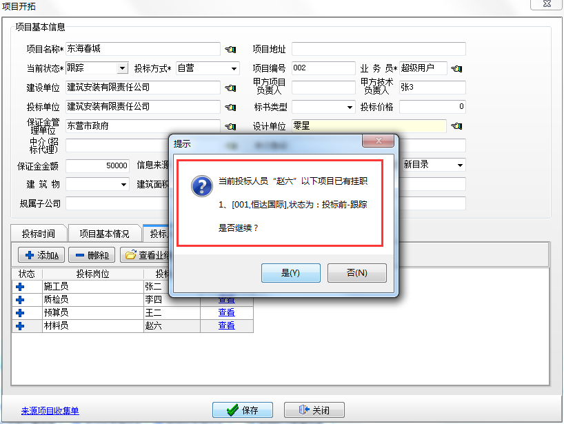 上圖中,張二、趙六兩個(gè)投標(biāo)人員已參與恒達(dá)國際的投標(biāo)項(xiàng)目,我們保存看下提示效果,如下圖: