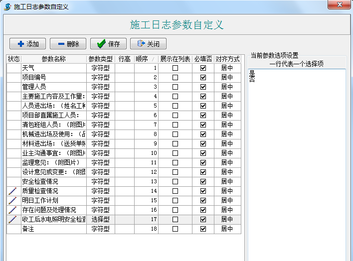 ①點(diǎn)“添加”按鍵增加豎列; ②在“參數(shù)名稱”列輸入需要的內(nèi)容; ③“參數(shù)類型”列選擇類型,其中“字符型”可輸入文字和數(shù)值、 “選擇型”可以如下圖中顯示一行代表一個(gè)選擇項(xiàng),只可選擇不能輸入 、“數(shù)值型”只能輸入數(shù)值,不能輸入文字內(nèi)容 、 “布爾型”則是勾選選擇型; ④“順序”列調(diào)整自定義項(xiàng)的先后排序 。