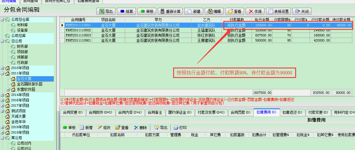 在工程項(xiàng)目管理中,工程款含甲供材費(fèi)用的情況經(jīng)常會(huì)遇到,若總包方對(duì)外分包而且分包款也是包含甲供材費(fèi)用的話,同樣的在分包管理中就應(yīng)該在分包工程款中扣除相應(yīng)的甲供材費(fèi)用?;蛘呶曳浇o分包商提供材料。為此金石工程項(xiàng)目管理軟件中做出相應(yīng)的解決方案,以下為示例說明