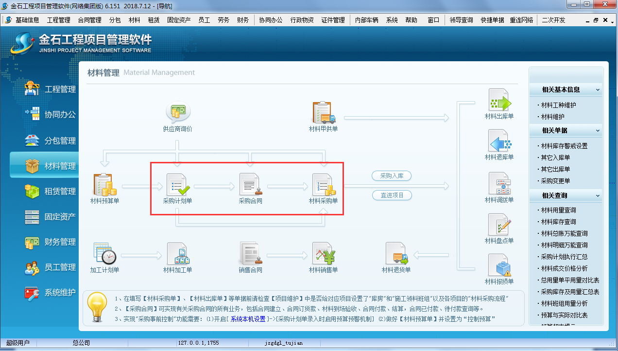 第一步,進(jìn)入工程項(xiàng)目管理系統(tǒng)的【材料管理】模塊,點(diǎn)擊[采購(gòu)合同],如圖: