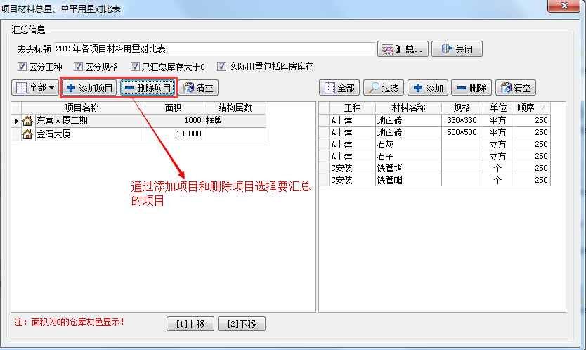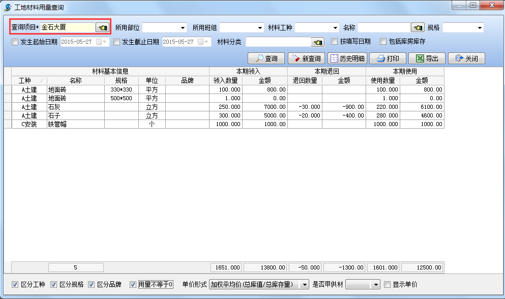 在工程項(xiàng)目管理系統(tǒng)中設(shè)置取消下面的過濾選項(xiàng)"用量不等于0,查詢結(jié)果如下圖:
