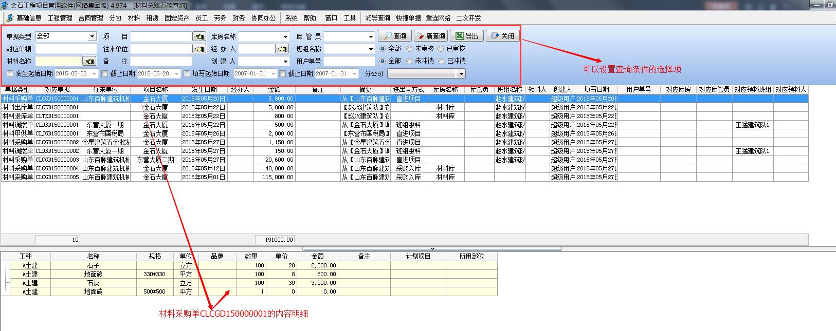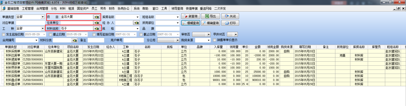 如下圖:查詢項(xiàng)目【金石大廈】所有【石子】材料的采購記錄,(通過【模糊查詢】)