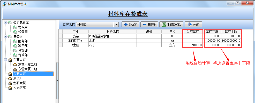 在工程項(xiàng)目管理系統(tǒng)中【材料庫存警戒設(shè)置】設(shè)置材料的庫存上限下限達(dá)到庫存預(yù)警的目的。如下圖:選擇項(xiàng)目為【金石大廈】,庫房為【材料庫】后設(shè)置的庫存材料的上限、下限