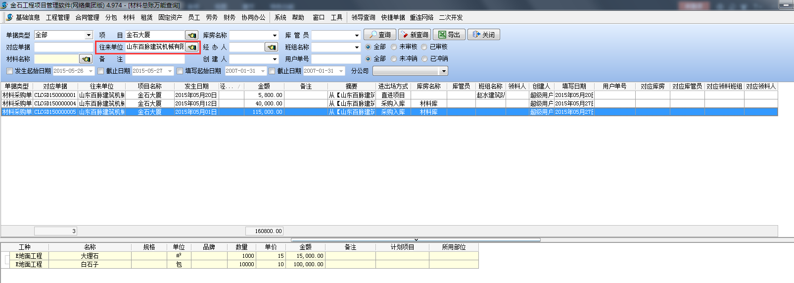 如下圖:查詢往來單位【山東百脈建筑機(jī)械有限公司】發(fā)生的所有材料的歷史記錄(與外單位發(fā)生的單據(jù)一般只有【材料采購單】、【材料退貨單】、【材料銷售單】)。