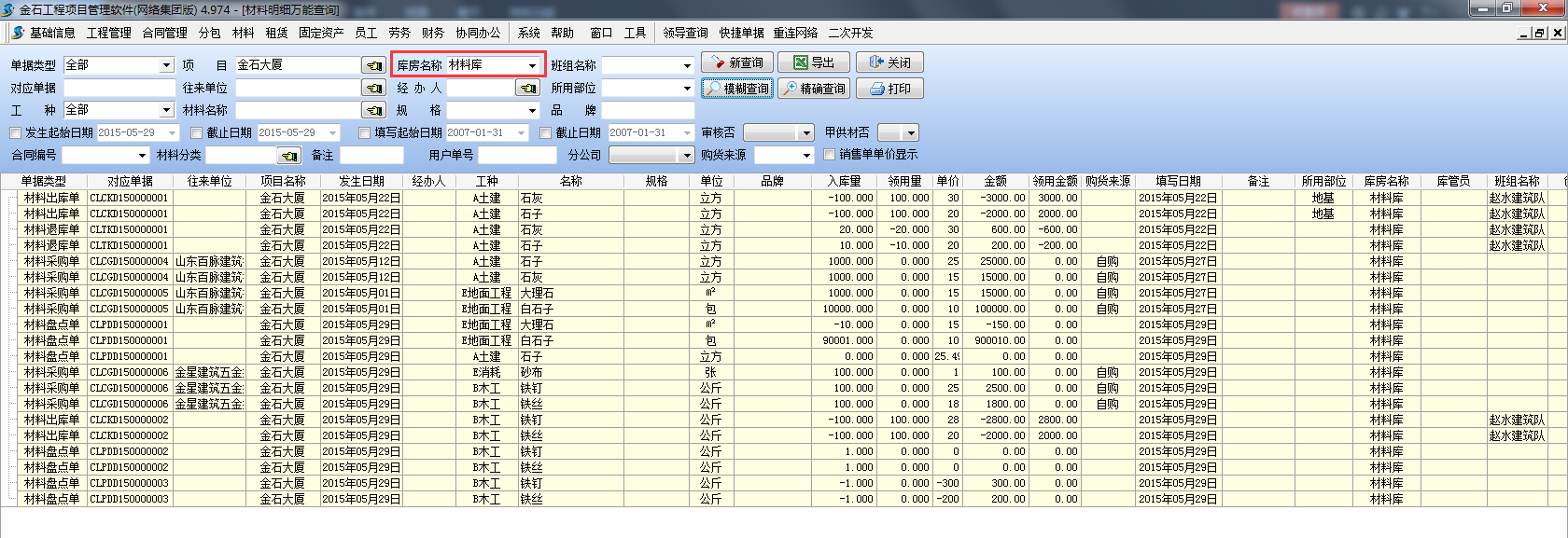 如下圖:查詢項(xiàng)目【金石大廈】下的庫房【材料庫】所有歷史記錄。