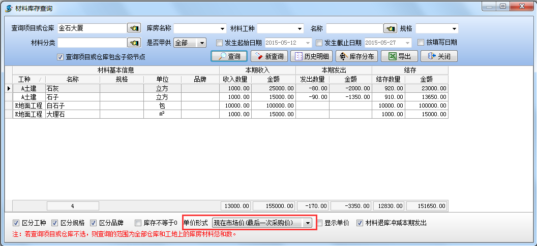 【材料庫存查詢】查詢某項(xiàng)目或某倉庫上的材料庫存(即庫房中的存量)。設(shè)置查詢項(xiàng)目為【金石大廈】,查詢結(jié)果如下圖:查詢當(dāng)前項(xiàng)目【金石大廈】(包括所有庫房)的材料庫存情況。