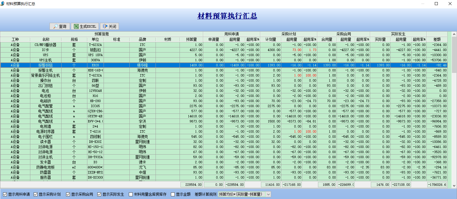 如果想全面統(tǒng)計材料用料申請、采購計劃、采購合同及實際發(fā)生等詳細情況,可以通過材料預(yù)算執(zhí)行匯總來查看,如下圖所示: