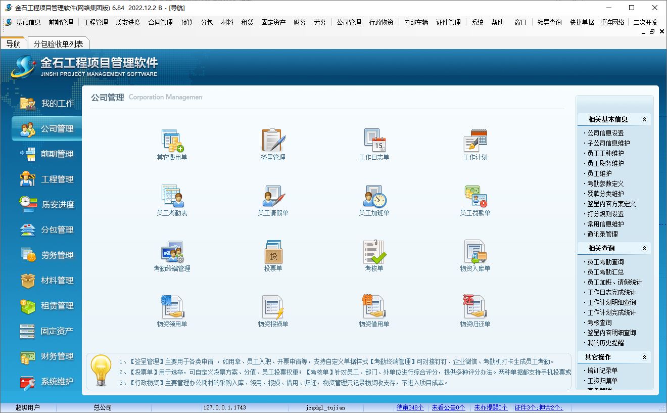 增加了公司管理,前期管理和勞務管理的導航模塊。公司管理模塊包括行政部門主要的管理內(nèi)容,如員工維護、員工考勤單、員工請假單、員工加班單、員工罰款單等員工管理的內(nèi)容;如物資入庫單、物資領(lǐng)用單、物資借用單、物資歸還單等行政物資的內(nèi)容;還增加了投票單和考核單的內(nèi)容。前期管理模塊主要包括項目收集單、項目開拓、投標資料庫、報價資料庫和投標人員業(yè)績查詢等內(nèi)容。勞務管理模塊主要是把原菜單的內(nèi)容添加進來,讓導航模塊內(nèi)容更充實。