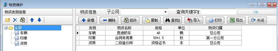 工程項(xiàng)目物資管理可用于管理車輛,印章,證書,資質(zhì),設(shè)備,辦公用品等物資的入庫,報(bào)損,借用,歸還等過程。錄入相關(guān)單據(jù)前,需先錄入要用到的基礎(chǔ)信息中的【物資維護(hù)】【子公司信息維護(hù)】。