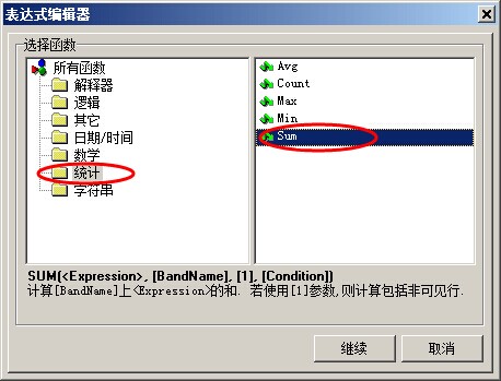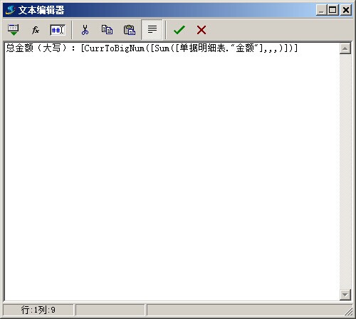 再來(lái)插入一個(gè)大寫,累計(jì)金額。同樣是選擇插入函數(shù),選擇字符串中的,CurrtoBigNum, 點(diǎn)繼續(xù)按鈕,然后把之前得出的結(jié)果[Sum([單據(jù)明細(xì)表."金額"],,,)]復(fù)制到里面。
