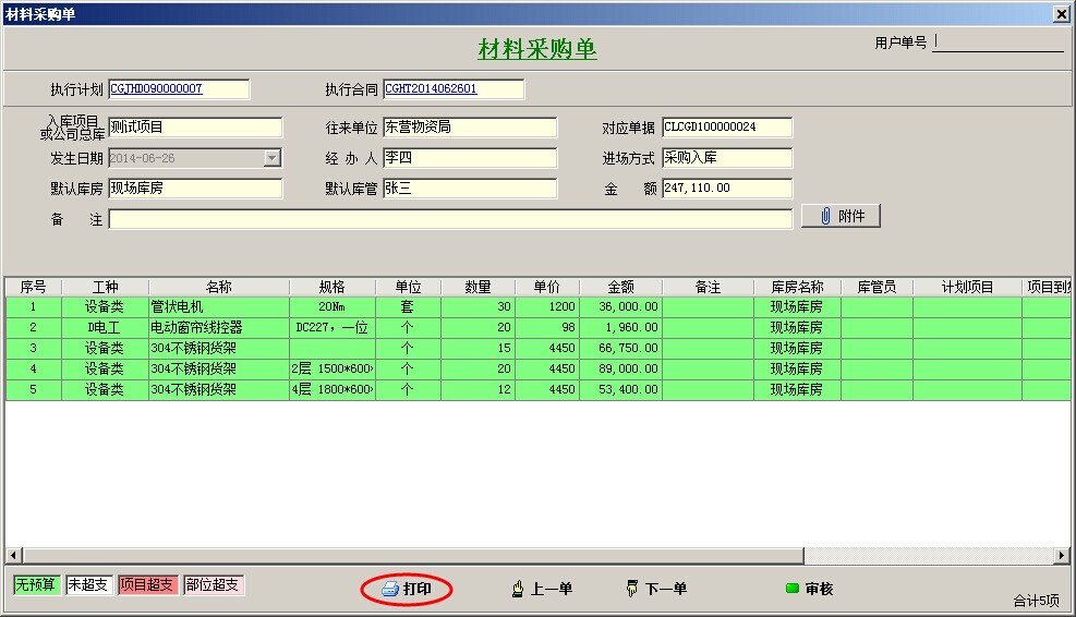 以下圖中單據(jù)(材料采購(gòu)單)為例,新建一個(gè)打印報(bào)表。