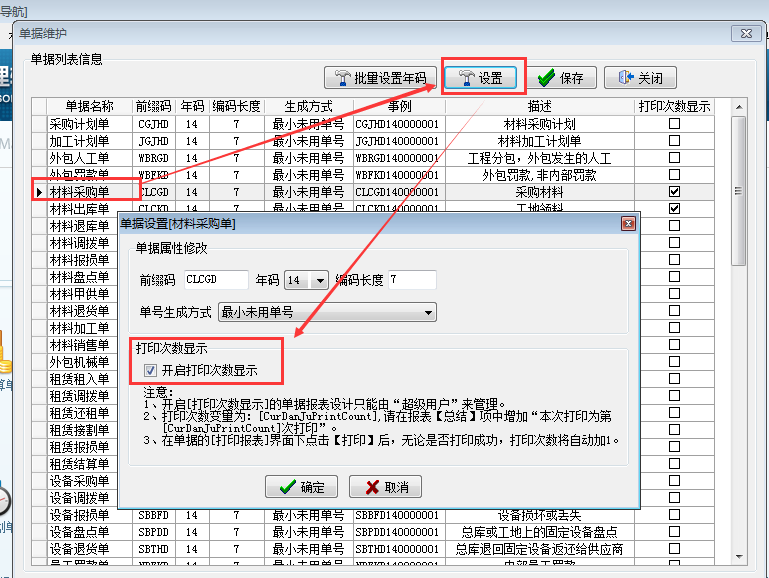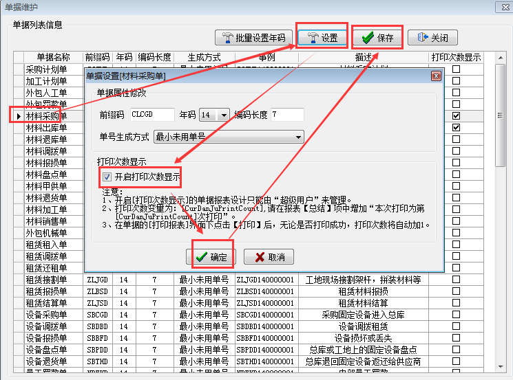 登錄超級(jí)用戶(hù),在菜單欄【系統(tǒng)】-【單據(jù)維護(hù)】找到對(duì)應(yīng)業(yè)務(wù)單據(jù),點(diǎn)擊設(shè)置按鈕在開(kāi)啟打印次數(shù)顯示處打上對(duì)勾,然后點(diǎn)擊確定。如下圖: