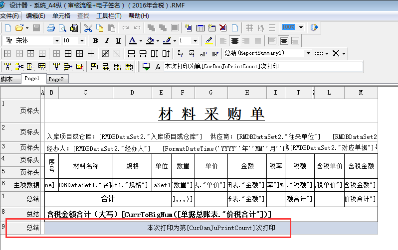 打印次數(shù)變量為:[CurDanJuPrintCount],在業(yè)務(wù)單據(jù)【打印】處,選中打印報(bào)表,點(diǎn)擊設(shè)計(jì)報(bào)表,在報(bào)表【總結(jié)】項(xiàng)中增加“本次打印為第[CurDanJuPrintCount]次打印。
