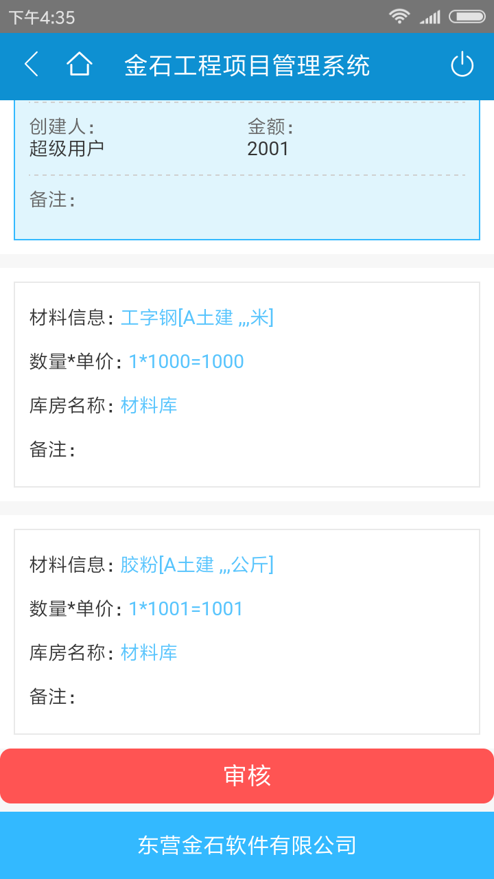 2.金石工程管理軟件手機(jī)端的操作,在配置好企業(yè)微信的前提下,進(jìn)入手機(jī)端的單據(jù)填寫并打開(kāi)審核中心,如圖所示