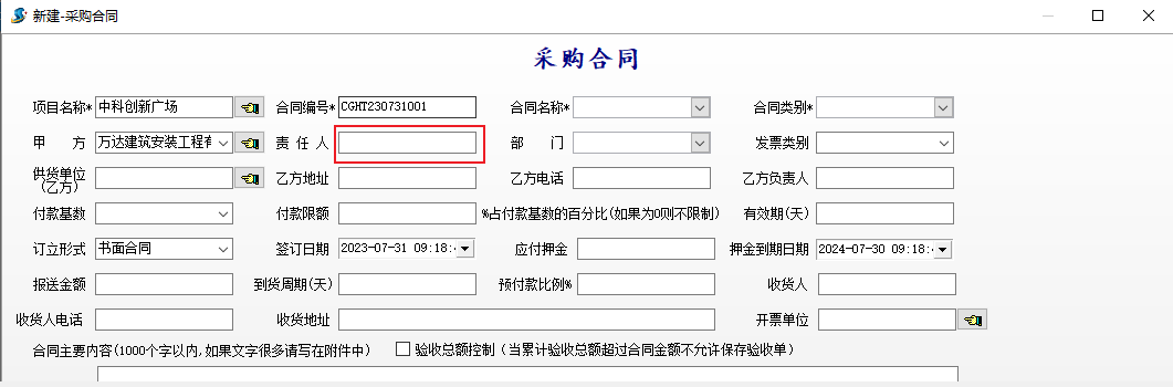 2、采購合同新建時,責(zé)任人留空,不再帶入上次記錄內(nèi)容。