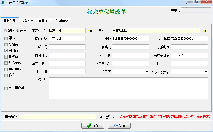 金石軟件增加往來單位增改單,可用于添加往來單位并可以進(jìn)行流程審批