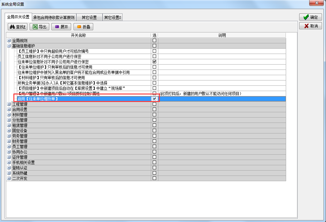使用該功能之前需在【系統(tǒng)全局設(shè)置】中開啟‘啟用【往來單位增改單】’,開啟后可以使用往來單位增改單新增或者修改往來單位,同時往來單位維護(hù)禁止使用新增和修改功能。