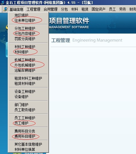 比較常用的是往來單位維護(hù)、分包內(nèi)容維護(hù)、材料維護(hù)、外包機(jī)械維護(hù)、員工維護(hù)、費(fèi)用科目維護(hù)。