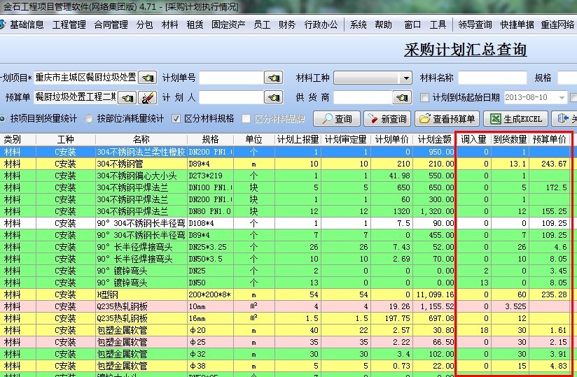 分析:公司給項目代購和調(diào)撥的主材費通過【材料管理】-【采購計劃執(zhí)行匯總】來核對得出,(調(diào)入量+到貨量)*預(yù)算單價。如下圖: