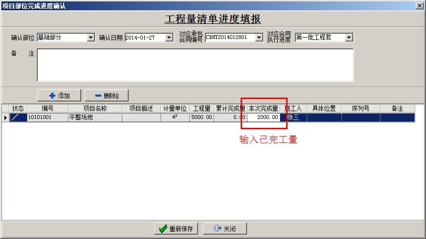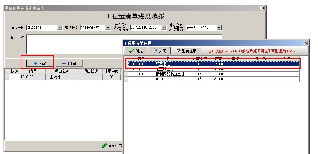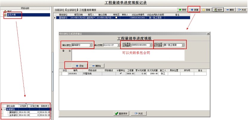 選中相應(yīng)的項(xiàng)目,點(diǎn)擊新建,填出工程量進(jìn)度填報(bào)窗口,選擇部位名稱,可以選擇關(guān)聯(lián)項(xiàng)目對(duì)應(yīng)的承包合同號(hào)和承包合同執(zhí)行進(jìn)度,然后點(diǎn)添加,調(diào)入清單內(nèi)容,在本次完成量處輸入已完成的工作量,不限制錄入進(jìn)度填報(bào),直至清單工作量完成,調(diào)入下一項(xiàng)清單內(nèi)容(如某項(xiàng)清單實(shí)際工程量超過清單預(yù)算量,可以繼續(xù)填報(bào))