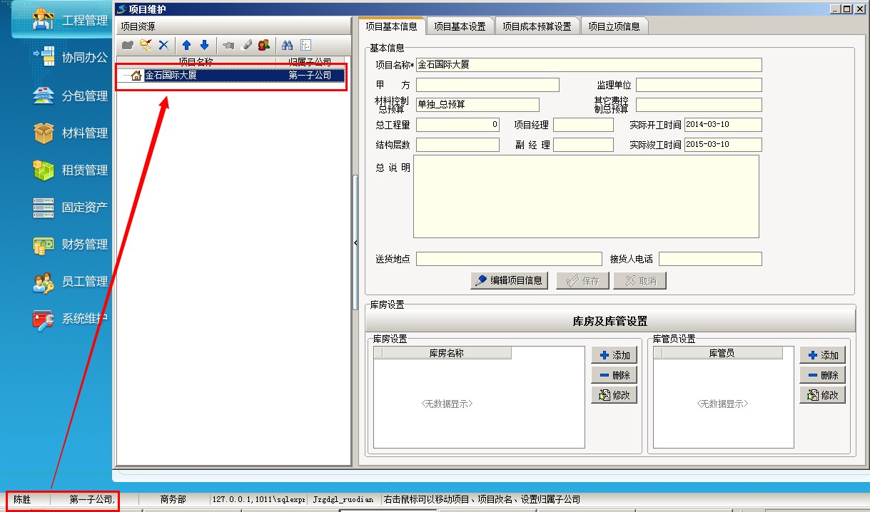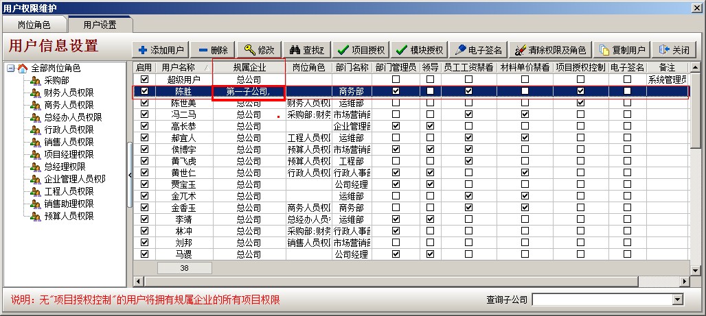 二、 項(xiàng)目按個(gè)人授權(quán) (注:適合普通企業(yè) 或 集團(tuán)公司下的分公司) 1、 以剛才陳勝為例,只讓他看到金石國際大廈 項(xiàng)目 (配合上面的項(xiàng)目按分公司授權(quán),這樣就可以實(shí)現(xiàn)集團(tuán)公司的項(xiàng)目二級(jí)授權(quán))具體操作:登錄超級(jí)用戶---系統(tǒng)維護(hù)---打開用戶管理權(quán)限設(shè)置,選擇員工陳勝,點(diǎn)項(xiàng)目授權(quán),開啟項(xiàng)目授權(quán)控制,在金石國際大廈這個(gè)項(xiàng)目前面打鉤