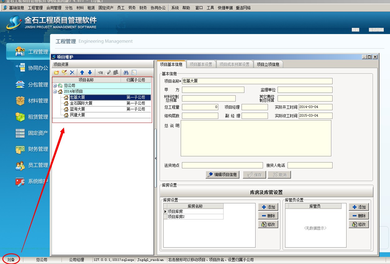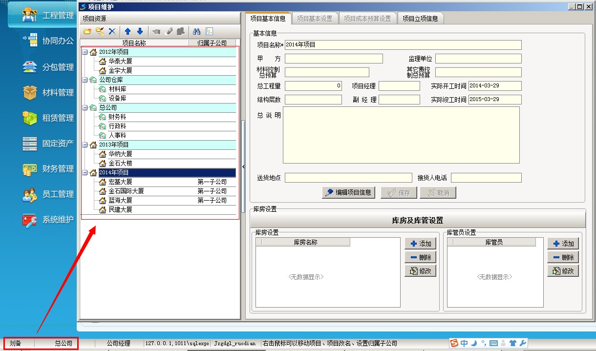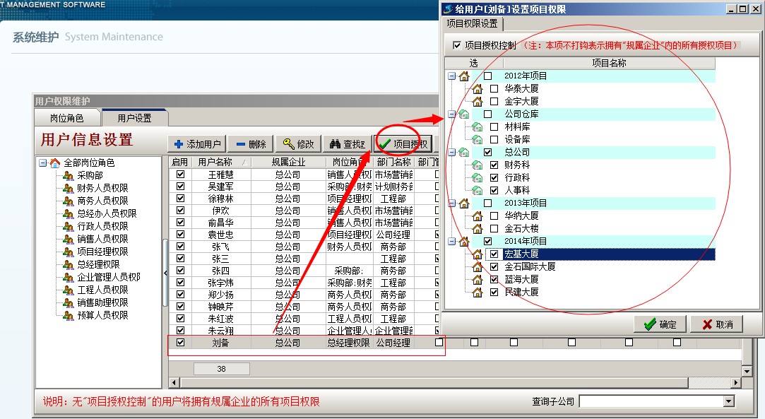 2、 建立用戶劉備 為總公司 直接 項(xiàng)目授權(quán) ,再登陸看下效果 首先建立劉備為總公司人員,擁有所有的項(xiàng)目權(quán)限,如下圖所示