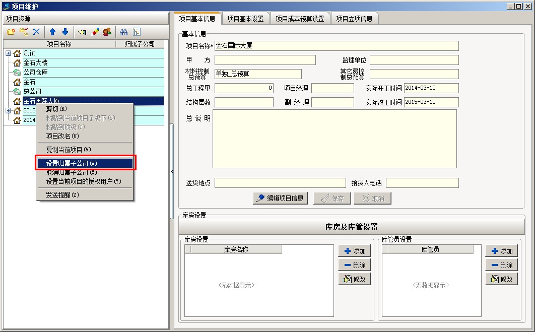 2、然后對(duì)項(xiàng)目進(jìn)行子公司授權(quán)。打開工程管理---項(xiàng)目維護(hù),在項(xiàng)目維護(hù)中的項(xiàng)目目錄中選擇需要設(shè)置的項(xiàng)目,右鍵,在下拉菜單中點(diǎn)擊設(shè)置歸屬子公司,在彈出的子