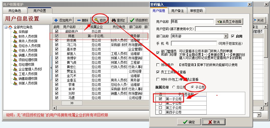 將陳勝設(shè)置為一分公司登錄超級(jí)用戶,導(dǎo)航欄---系統(tǒng)維護(hù)---用戶管理權(quán)限設(shè)置,打開權(quán)限維護(hù)窗口,選中陳勝,點(diǎn)修改,在彈出的密碼修改窗口,選擇歸屬公司為子公司,子公司名稱為第一子公司