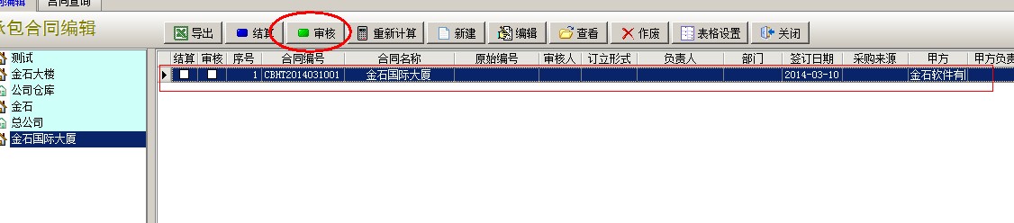 左邊選中新建的項(xiàng)目名稱金石國(guó)際大廈,右邊點(diǎn)擊新建,彈出新建承包合同窗口,錄入合同基本信息,填寫合同履約保證金金額,然后保存。